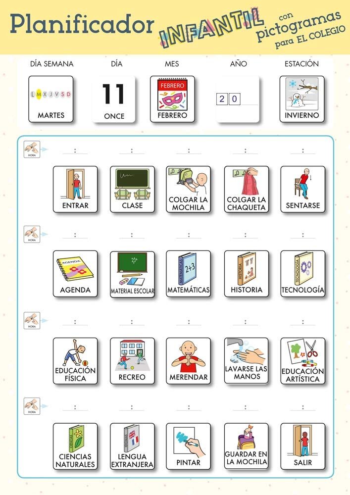 Las agendas con pictogramas son un instrumento de comunicación muy efectivo para niños con autismo y otros trastornos del lenguaje. Los pictogramas son muy beneficiosos porque reducen el estrés, porque anuncian a la persona cuando empieza o termina una tarea.